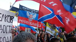 A 2014 rally in support of re-creating "Novorossiya" (New Russia), a former imperial territory in Ukraine. Shown are the black-yellow-white flag of the Russian Empire and flags of Russian separatist forces in Ukraine.