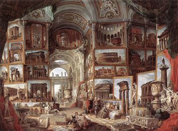 كلسكة الباروك المتأخر: ج. پ. پانيني تجمع قانون الأطلال الرومانية والنحت الروماني في معرض تخيلي ضخم (1756)