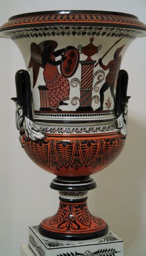 ڤازة پورسلين على شكل "ڤازة مديتشي"، مزينة بأسود وأحمر "پومپي"، سانت بطرسبرگ، حوالي 1830