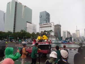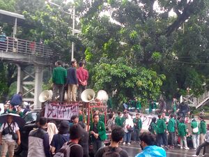 In Jakarta, the protests started on 17 February at Horse Statue, Central Jakarta, but then spread into South Medan Merdeka and West Medan Merdeka Roads, causing traffic jams at Bundaran HI. Thousands[60] of protesters shouted hidup mahasiswa ('long live students') and carried various banners and posters that represent their demands, such as #krisisiklimkrisisdemokrasi ('a climate crisis is a democratic crisis') and kenyang kagak, bego iya ('not yet full, stupid yes').[13]