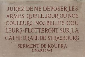 The French 2nd Armored Division, tip of the spear of the Free French forces that had participated in the Normandy Campaign and had liberated Paris on 25 August 1944, went on to liberate Strasbourg on 22 November 1944, thus fulfilling the Oath of Kufra made by General Leclerc almost four years earlier. The unit under his command, barely above company-size when it had captured the Italian fort, had grown into a full-strength armoured division.