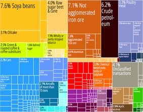 الطائرات، الأسلحة، الصلب، الآلات، معدات النقل، السيارات، قطع غيار السيارات، المعدات الكهربائية، الأدوات المطبخية، النفط، الحديد شبه المصنع، خام الحديد، اللب (السليلوز)، فول الصويا، الذرة، لحم البقر، لحم الدجاج، لحم الخنزير، وجبات فول الصويا، السكر، البن، قصب السكر، التبغ، القطن، عصير البرتقال، الذهب، الإيثانول
