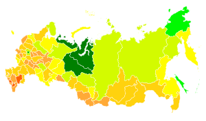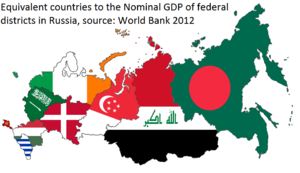 GDP per capita (PPP) in 2009–2013,[43] تبين البلدان التي لديها ن.م.إ. أعلى أو أقل من روسيا
