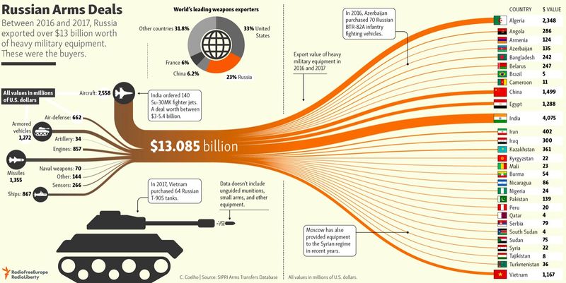 تمتلك روسيا صناعة سلاح ضخمة ومتطورة قادرة على تصميم وتصنيع معدات عسكرية عالية التقنية، وتشمل مقاتلات نفاثة من الجيل الثالث. في النصف الثاني من 2013 وصلت القيمة الإجمالي لصادرات السلاح الروسي للولايات المتحدة إلى 15.7 بليون دولار. من أهم الصادرات العسكرية الورسية الطائرات المقاتلة، نظم الدفاع الجوي، السفن، والغواصات.[23]