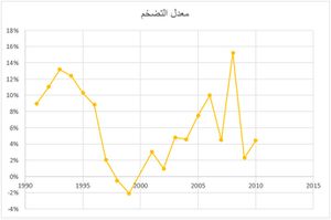 ويُظهر معدل التضخم الذي يُؤثّر ارتفاعه على قيمة العملة وقوتها الشرائية في الفترة بين 1990 - 2010 تبايناً في الأداء، إذ ارتفع معدل التضخم بشكل ملحوظ في عام 1993، حيث وصل إلى 13.2% نتيجة سياسات الانفتاح الاقتصادي بعد سن القانون رقم (10) للاستثمار وارتفاع أجور العاملين في القطاع العام، والتوجه واتباع الحكومة سياسة التمويل بالعجز منذ عام 1985، وعاد التضخم لينخفض خلال السنوات اللاحقة بشكل تدريجي، ليُحقّق معدلاً سالباً في عام 1999 عند (-2.1%). وارتفع مجدداً خلال العامين 2003 – 2004 إلى (4.8%) و(4.6%) على التوالي، بعد أن كان 1% في عام 2002. ويعود ذلك بسبب ارتفاع سلة من السلع والخدمات في التعليم والإيجار بعد ازدياد هجرة العراقيين إلى سوريا بعد عام 2003، وبلغ التضخم ذروته في عام 2008 عندما وصل إلى (15.2%)