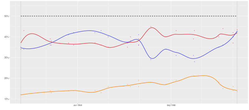 قالب:1968 United States presidential election imagemap Presidential election results map. Red denotes states won by Nixon/Agnew, blue denotes those won by Humphrey/Muskie, and orange denotes those won by Wallace/LeMay, including a North Carolina faithless elector. Numbers indicate electoral votes cast by each state and the District of Columbia. | |||||||||||||||||||||||||||||||||||||