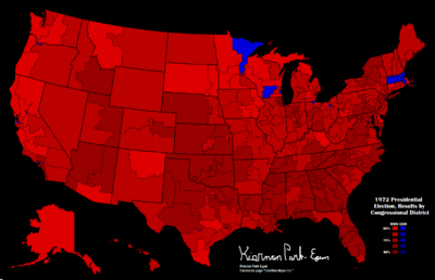 قالب:1972 United States presidential election imagemap Presidential election results map. Red denotes states won by Nixon/Agnew and blue denotes those won by McGovern/Shriver. Gold is the electoral vote for Hospers/Nathan by a Virginia faithless elector. Numbers indicate electoral votes cast by each state and the District of Columbia. | |||||||||||||||||||||||||||||