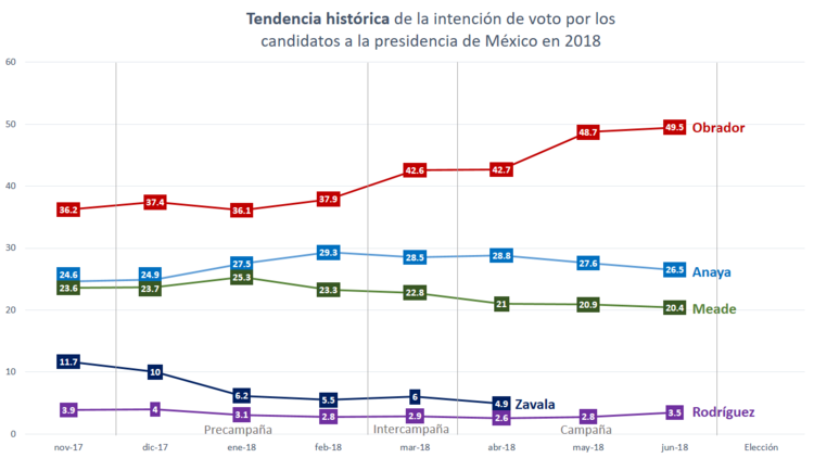 Seis candidatos a la carrera para ocupar Los Pinos a partir del próximo primero de diciembre por un período de cinco años y 10 meses. (A partir de la Reforma Electora de 2014, el Presidente de los Estados Unidos Mexicanos tomará posesión el 1 de octubre de cada año empezando en 2024 por un período de seis años.)