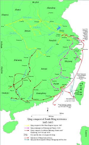 It was such a Qing army composed mostly of Han Chinese Bannermen which attacked Koxinga's Ming loyalists in Nanjing.[146] The Manchus sent Han Chinese Bannermen to fight against Koxinga's Ming loyalists in Fujian.[147] The Qing carried out a massive depopulation policy and clearances, forcing people to evacuate the coast in order to deprive Koxinga's Ming loyalists of resources: this led to a myth that it was because Manchus were "afraid of water". In fact, in Guangdong and Fujian, it was Han Bannermen who were the ones carrying out the fighting and killing for the Qing and this disproves the claim that "fear of water" on part of the Manchus had to do with the coastal evacuation to move inland and declare the sea ban.[148] Most of the coastal population of Fujian fled to the hills or to Taiwan to avoid the war; Fuzhou was an empty city when the Qing forces entered it.[149]