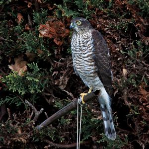 شخص يُمسكُ بباشقٍ أوراسي، لاحظ حجم الطائر الصغير عند مُقارنته بحجم وطول ذراع الشخص القابض عليه.