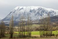 Most foothills of the Pyrenees are on the Spanish side, where there is a large and complex system of ranges stretching from Spanish Navarre, across northern Aragon and into Catalonia, almost reaching the Mediterranean coast with summits reaching 2،600 m (8،500 ft).[12] At the eastern end on the southern side lies a distinct area known as the Sub-Pyrenees.[13]