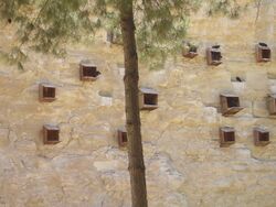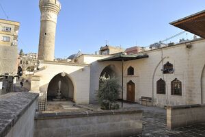 Historically, Birecik's urban fabric was made up of stone houses.[7] The stone used in these houses was mostly derived from two sources.[7] The first is limestone quarried from Kalazan Dağı, northwest of the city.[7] This stone, which was also used to build other historical buildings in Birecik, is derived from the upper limestone member of the Gaziantep Formation and is resistant to weathering.[7] Four old quarries at Kalazan Dağı have been identified.[7] The other type main type, used particularly in later times, is the marly limestone known as havara coming from a quarry east of Birecik.[7] This type is less resistant to weathering.[7] In some buildings, both types of stone were used.[7] More recently, Urfa limestone has also been used in restoration work on historic buildings.[7] One example is the Mahmutpaşa Cami, which now has examples of all three types of stone.[7]