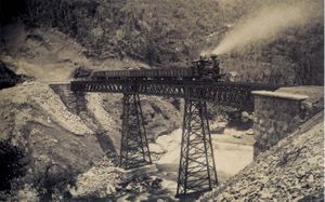 Estrada de ferro في Petrópolis، في 1885. O advento dos trens tornou o transporte de carga menos oneroso e mais rápido, diminuindo consideravelmente o custo de produção.