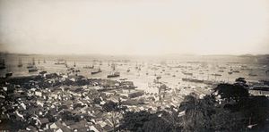Vista do Centro da cidade do Rio de Janeiro em 1889. O comércio exterior brasileiro cresceu a uma taxa média anual de 3,88% durante 47 سنة.