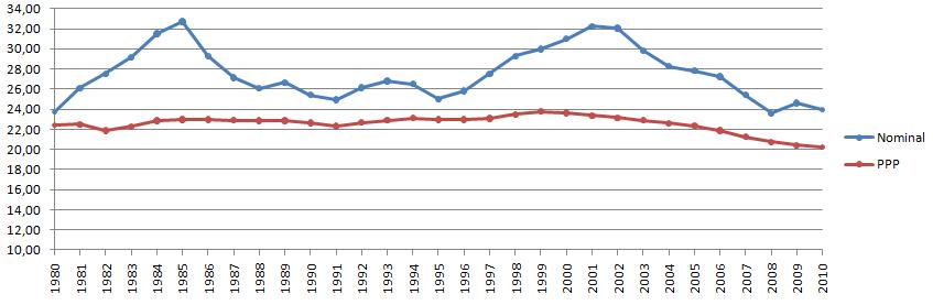 US share of world GDP (nominal) peaked in 1985 with 32.74% of global GDP (nominal). The second highest share was 32.24% in 2001.