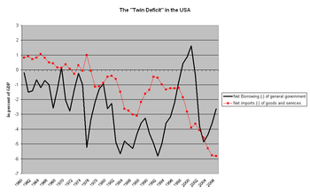 كان وجه القصور الوحيد في الاقتصاد الأمريكي هو الميزان التجاري الخاسر، الذي تفاقهم عجزه بشدة خلال تلك الفترة. لكن ذلك ان يعزى أساسا ليس إلى ضعف الاقتصاد الامريكي ، بل إلى ذعف الاقتصادات الاجنبية. لقد بلغ اقتصاد اليابان - الذي كان ذات يوم ضربا للمثل - ذروةه في العام 1989. ثم غرق في ركود مزمن سيخرج منه كرة أخرى بعد حين ، كما هبط مؤشر سوق الأسهم الرئيسي فيها إلى ثلاثة أرباع أعلى مستوى وصل إليه. كما أن اوروبا - وهي المركز الاقتصادي الرئيسي الثاني في العالم - لم تكن تحقق نموا يقارب على الإطلاق ذاك الذي حققته الولايات المتحدة ، كما ظلت معدلات البطالة في كثير من دولها فوق مستوى 10 في المائة من دون أن تبدو في الأفق أي نزعة للإنخفاض.