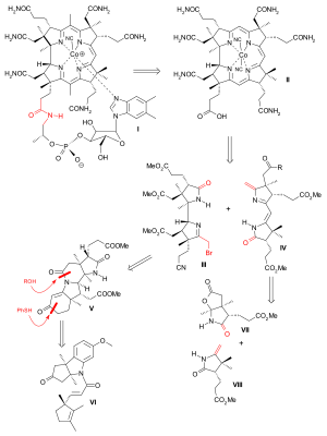 Vitamin B12 total synthesis: Retrosynthetic analysis of the Woodward–Eschenmoser total synthesis that was reported in two variants by these groups in 1972. The work involved more than 100 PhD trainees and postdoctoral fellows from 19 different countries. The retrosynthesis presents the disassembly of the target vitamin in a manner that makes chemical sense for its eventual forward construction. The target, Vitamin B12 (I), is envisioned being prepared by the simple addition of its tail, which had earlier been shown to be feasible. The needed precursor, cobyric acid (II), then becomes the target and constitutes the "corrin core" of the vitamin, and its preparation was envisaged to be possible via two pieces, a "western" part composed of the A and D rings (III) and an "eastern" part composed of the B and C rings (IV). The restrosynthetic analysis then envisions the starting materials required to make these two complex parts, the yet complex molecules VVIII.