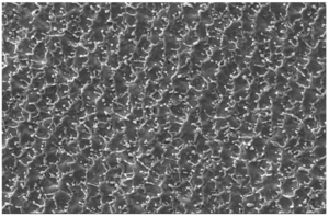 Laser roughening of titanium surfaces for epoxy bonding is a good option when abrasives and chemical agents are restricted in the manufacturing area. The process is also more repeatable and consistent than the often manual abrasive blasting. Other advantages over abrasives are touch time and maintenance. The drawback of laser roughening is the cost of the equipment and tooling. Also, the laser will heat the material depending on its power output and number of passes. It will remove material from the surface and create regions of hardened material that get relocated within the surface. Neodymium doped yttrium aluminum garnet (Nd:YAG), CO2, green, femtosecond lasers can be used depending on the workpiece and adhesion requirements. YAG or fiber laser markers that anneal the titanium surface are the low cost solution while the femtosecond laser is on the high end of the cost scale. Surface roughness of laser roughened surfaces is best measured using a three-dimensional scanning laser microscope or a non-contact profilometer. XPS and SEM analysis of alloyed titanium, like grade 5, will show the segregation of the aluminum and vanadium. Oftentimes, the laser roughening is done in ambient conditions with or without argon shielding gas. Ambient elements that play no role in bonding like carbon and nitrogen can be ignored from the surface analysis. Laser roughening of grade 5 titanium will show that the vanadium will segregate to the bulk of the alloy and appear at the surface with an increased oxygen level. Lap shear tests have shown that this segregation does not affect surface adhesion. The increase of laser power has shown to increase oxidation of grade 5 titanium which has been correlated to increase bond strength.[8] Also, producing alumina at the surface has shown to improve bonding. Dimples created by multiple laser pulses increase the surface area for adhesion, but the center of the topography will have reduced oxide formation because of the laser-induced plasma.[9] Depending on the grade of titanium and the adhesive used, the laser parameters of power, frequency, and pattern can be tailored to the loading requirements and the aforementioned surface elemental beneficial conditions. Unwanted metal oxide can occur when higher laser powers and multiple passes are employed. These can be removed with a lower powered laser pass or a titanium brush, post roughening. The grain size will affect the surface roughness, hardness, and wettability of the surface. On grade 2 titanium, a smaller grain structure improved these surface prep characteristics.[10] As with abrasives, a silane primer application is used to seal the laser roughened surface.