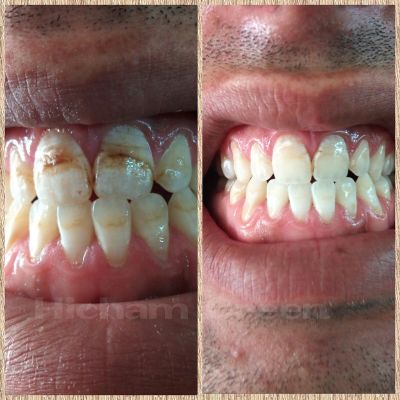 حالة معتدلة من التسمم الفلوري للأسنان (the white streaks on the subject's upper right central incisor) observed in dental practice