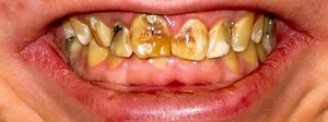 Moderate All tooth surfaces affected; marked wear on biting surfaces; brown stain may be present