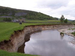 مثال على التعرية النهرية في نهر سكيرفير، ليتونديل، شمال يوركشاير، إنگلترة.