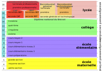 نظام التعليم الفرنسي عالي المركزية والتنظيم والأثر. وينقسم إلى ثلاث مراحل: