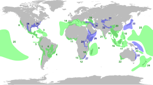 Colombia is one of seventeen megadiverse countries in the world.[7] The country in northwestern South America contains 311 types of coastal and continental ecosystems.[1] As of the beginning of 2021, a total of between 63,000 and 71,000 species are registered in the country,[8][5] with 8803 endemic species, representing near the 14% of the total registered species.[6] Colombia is the country with the most páramos in the world; more than 60% of the Andean ecosystem is found within Colombian territories.[11] Boyacá is the department where 18.3% of the national total area is located.[12] Since December 20, 2014, Colombia hosts 59 protected areas.[13] The biodiversity is highest in the Andean natural region, followed by the Amazon natural region.[14] Since 1998, the Humboldt Institute for Biological Resources in the country has been collecting samples of biodiversity. As of 2014, 16,469 samples, representing around 2530 species from 1289 genera, and 323 families of the Colombian biodiversity have been stored in their archives.[15]