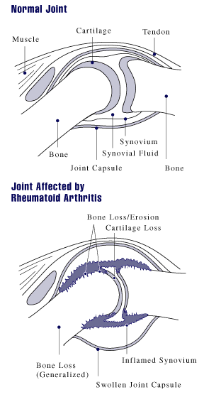 رسم يوضح تاثير التهاب المفاصل الرثياتي على الأغشية المبطنة للمفاصل