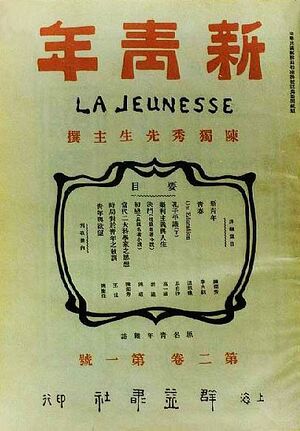 In the first decade of the twentieth century, young Chinese intellectuals such as Ma Junwu, Liang Qichao, and Zhao Bizhen were the first to translate and summarize socialist and Marxist ideas into Chinese.[43][44][45] However, this happened on a very small scale, and had no immediate impacts. This would change following the 1911 Revolution, which saw military and popular revolts overthrow the Qing Dynasty.[46][47] The failure of the new Chinese Republic to improve social conditions or modernize the country led scholars to take a greater interest in Western ideas such as socialism.[48][49][50] The New Culture Movement was especially strong in cities like Shanghai, where Chen Duxiu began to publish the left-leaning journal New Youth in 1915.[51] New Youth quickly became the most popular and widely distributed journal amongst the intelligentsia during this period.[52]