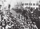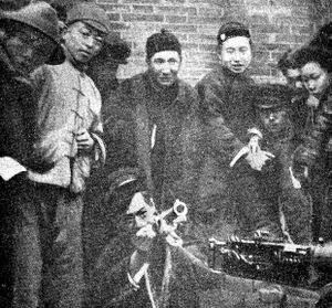 By 1926 the Kuomintang (KMT) had solidified their control over Guangdong province enough to rival the legitimacy of the Beiyang government based in Beijing.[102] After purging his opponents in the KMT leadership, Chiang Kai-shek was appointed Generalissimo of the National Revolutionary Army and set out to defeat the warlords one at a time. The campaign saw massive success against Wu Peifu in Hunan, Hubei, and Henan. Sun Chuanfang put up a stronger resistance, but popular support for the KMT and opposition to the warlords helped the National Revolutionary Army (NRA) make inroads into Jiangxi, Fujian, and Zhejiang. As the NRA advanced, workers in the cities organized themselves into left-leaning trade unions: in Wuhan, for example, more than 300,000 had joined trade unions by the end of the year.[103] The All-China Federation of Labor (ACFL), founded by the Communists in 1925, reached 2.8 million members by 1927.[104]