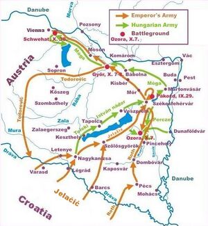 Hungary now had war raging on three fronts: Jelačić's Croatian troops to the South, Romanians in Banat and in Transylvania to the East, and Austria to the west.