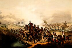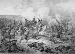 After a series of serious Austrian defeats in 1849, the Austrian Empire came close to the brink of collapse. The new emperor Franz Joseph I had to call for Russian help in the name of the Holy Alliance.[9] In the hope of Russian military support, the young Emperor Franz Joseph kissed the hands of the Ruler of all the Russians in Warsaw on 21 May 1849.[10] Tzar Nicholas agreed with Franz Joseph and sent a 200,000 strong army with 80,000 auxiliary forces. The joint Russo-Austrian army finally defeated the Hungarian forces, Habsburg power was restored and Hungary was placed under martial law.[11]