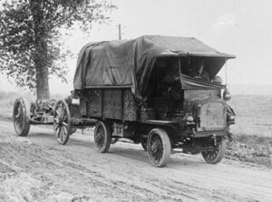 Before U.S. entry in WW I, many American-made heavy four-wheel drive trucks, notably made by Four Wheel Drive (4WD) Auto Company, and Jeffery / Nash Quads, were already serving in foreign militaries, bought by Great Britain, France and Russia. When WW I started, motor vehicles had begun to replace horses and pulled wagons, but on the European muddy roads and battlefields, two-wheel drive trucks got stuck all the time, and the leading allied countries could not produce 4WD trucks in the numbers they needed.[24] The U.S. Army wanted to replace four-mule teams used for hauling standard 11⁄2 U.S. ton (3000 lb / 1.36 metric ton) loads with trucks, and requested proposals from companies in late 1912.[25] This led the Thomas B. Jeffery Company to develop a competent four-wheel drive, 11⁄2 short ton capacity truck by July 1913: the "Quad".