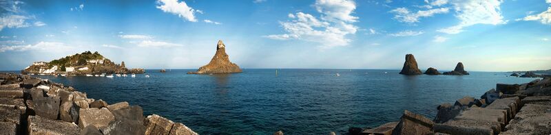 The Cyclopean Isles (Italian: Isole Ciclopi), noted for their rows of basaltic columns piled one above another, lie not far from Mount Etna off the eastern coast of Sicily in the Mediterranean Sea.
