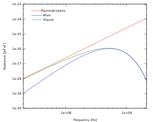 في نفس الوقت حاول العالمان الإنجليزيان رايلى وجينس وصف الكيف الحراري، وتوصلا إلى معادلة أخرى تعطي العلاقة بين الطاقة الصادرة من الجسم الأسود وعلاقتها بدرجة حرارة الجسم. إلا أن معادلتهما لم تحقق النجاح الكافي، ونري في الشكل على اليمين المنحني الناتج عن معادلتهما.