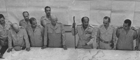 غرفة عمليات حرب أكتوبر: يمين السادات: احمد اسماعيل, محمد علي فهمي, محمد سعيدالماحى. شمال السادات : الجمسي, حسنى مبارك, فؤاد نصار