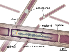 Photomicrograph of Bacillus anthracis (fuchsin-methylene blue spore stain). | |