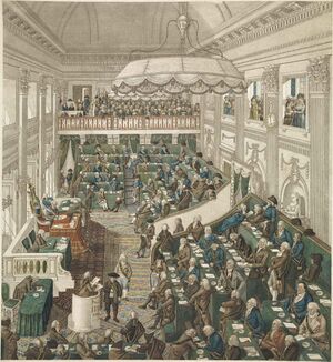 Like the old revolutionary States-General, the new National Assembly contained radically opposed parties: the unitary democrats, led by Pieter Vreede, Johan Valckenaer and Pieter Paulus, and the federalists, such as Jacob Abraham de Mist and Gerard Willem van Marle.[25] But there was a broad continuum of opinion between these poles. In this force-field the federalists held the upper hand after the sudden demise of Paulus (who might otherwise have acted as a unifier). The conservative federalists were more adept at parliamentary manoeuvering. Rutger Jan Schimmelpenninck proved himself especially adept at this. The frustration this engendered among the democrats led them to appeal to popular opinion and to extra-parliamentary action. Meanwhile, the Assembly installed a constitutional commission that in November 1796 presented a report that amounted to a continuation of the old federal arrangements. As this was totally unacceptable to the unitarists, this draft was subsequently amended into its opposite, by a compromise that finally formed a basis for a new Constitution.[26] The Assembly now began discussing other important matters, such as the separation between church and state, and the emancipation of minorities. The organs of the state were to be a bicameral Legislative Corps, to be elected in indirect elections, and a Directory-like Executive of five members. The end result looked much like the French Constitution of 1795. This was approved by the Assembly on 10 May 1797.[27]