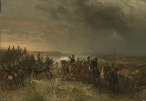 The French Revolutionary War proceeded disastrously for the forces of the Stadtholder. In the severe winter of 1794/95 a French army under General Charles Pichegru, with a Dutch contingent under General Herman Willem Daendels, crossed the great frozen rivers that traditionally protected the Netherlands from invasion. Aided by the fact that a substantial proportion of the Dutch population looked favorably upon the French incursion, and often considered it a liberation,[10] the French were quickly able to break the resistance of the forces of the Stadtholder and his Austrian and British allies. However, in many cities revolution broke out even before the French arrived and Revolutionary Committees took over the city governments, and (provisionally) the national government as well.[11] William was forced to flee to England on a fishing boat on 18 January 1795.[12]
