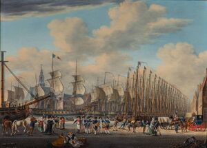 The French presented themselves as liberators.[13] But there were acrimonious negotiations between the representatives of the new Batavian Republic and those of the French Republic, and a harsh Treaty of The Hague was concluded on 16 May 1795. In addition to imposing territorial concessions and a huge indemnity, the treaty obligated the Dutch to maintain a French army of occupation of 25,000 men.[14] To fulfill its responsibilities, Dutch financier Pieter Stadnitski joined a committee at the end of July 1795.[15] To beat hyperinflation it was announced that from 3 August French soldiers in the Batavian Republic would be paid in sound Dutch currency and going forward no one could be obliged to accept French assignats.[16] This changed the Dutch republic from a client state of Great Britain and Prussia into a French one;[أ] henceforth it would conduct a foreign and military policy dictated by France, where its predecessor had followed British dictates since 1787 (an offensive and defensive alliance of the two republics was part of the treaty). With the treaty, economic policies would in effect also be made subservient to the interests of France, but this did not mean that it lost its independence in all respects. The program of reform that the Dutch revolutionaries attempted to put in place, constrained by the political realities of the French revolution, was mostly driven by Dutch needs and aspirations. The political events in the Netherlands were mainly derived from Dutch initiative, with some notable exceptions. The French were responsible for at least one of the coups d'état, and the French ambassador often acted as a proconsul.[18]