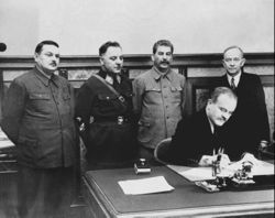 من الجانب السوڤيتي أندريه ژدانوڤ وكلمنت ڤوروشيلوڤ ويوسف ستالين وفياچسلاڤ مولوتوڤ (الذي يكتب) يوقعون صفقة تبادل أراضي بين الجمهورية الديمقراطية الفنلندية مع رئيس وزراءها أوتو ڤيله كوسينن (إلى اليمين).