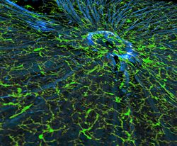 Microscopically, there are differences between the neurons and tissue of the CNS and the peripheral nervous system (PNS).[12] The CNS is composed of white and gray matter.[10] This can also be seen macroscopically on brain tissue. The white matter consists of axons and oligodendrocytes, while the gray matter consists of neurons and unmyelinated fibers. Both tissues include a number of glial cells (although the white matter contains more), which are often referred to as supporting cells of the CNS. Different forms of glial cells have different functions, some acting almost as scaffolding for neuroblasts to climb during neurogenesis such as bergmann glia, while others such as microglia are a specialized form of macrophage, involved in the immune system of the brain as well as the clearance of various metabolites from the brain tissue.[7] Astrocytes may be involved with both clearance of metabolites as well as transport of fuel and various beneficial substances to neurons from the capillaries of the brain. Upon CNS injury astrocytes will proliferate, causing gliosis, a form of neuronal scar tissue, lacking in functional neurons.[7]