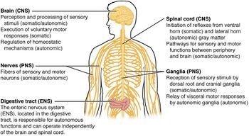 Schematic diagram showing the central nervous system in yellow, peripheral in orange | |