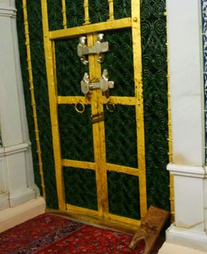 كُتب حول الحجرة النبوية قصيدة في مدح النبي محمد ، مسطرة بماء الذهب، طُمس بعض أبياتها لوجود ألفاظ تدل على شرك بالله في أبياتها، نظمها السلطان عبد الحميد خان بن السلطان أحمد خان عام 1191 هـ،[12] وقد استخرجت من كتاب تركي قديم هو "مرآة الحرمين الشريفين وجزيرة العرب " لأيوب صبري باشا، وهي[13]: