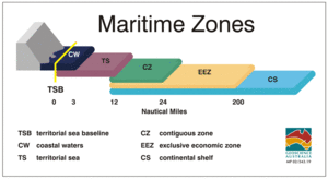 - البحر الاقليمي—منطقة تمتد مسافة 12 عقدة بحرية من الشريط الساحلية.[2]