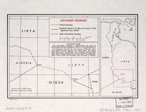 3. ^ أ ب International Boundary Study No. 2 – Libya-Niger Boundary, 4 May 1961, https://fall.fsulawrc.com/collection/LimitsinSeas/IBS002.pdf, retrieved on 4 November 2019
