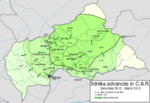 في 23 يناير 2013، اخترق وقف إطلاق النار، وألقت الحكومة باللوم على سيليكا[92] وألقت سيليكا اللوم على الحكومة لفشلها المزعوم في احترام شروط اتفاقية تقاسم السلطة.[93] بحلول 21 مارس، تقدم المتمردون إلى بوكا، على بعد 300 كيلومتر من العاصمة بانگي.[93] في 22 مارس، وصل القتال إلى بلدة دمارا، على بعد 75 كم من العاصمة.[94][95]