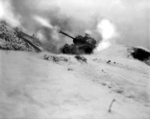 مع عقارب الساعة من أعلى: رتل من مشاة ومدرعات الفرقة الأولى مارينز الأمريكي تتحرك عبر الخطوط الصينية أثناء خروجهم من خزان تشوسين؛ الأمم المتحدة تقوم بإبرار في ميناء إنشون، وكانت نقطة بداية معركة إنشون؛ لاجئون كوريون أمام دبابة إم26 پرشنگ أمريكية؛ المارينز الأمريكان، بقيادة الملازم أول مارينز بالدومرو لوپيز أثناء الإبرار في إنشون؛ مقاتلات إف-86 سيبر تحلق فوق كوريا.