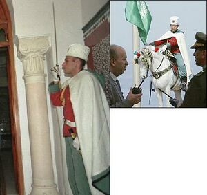 يرتدي جنود الحرس المشاة زياً رسمياً يجمع بين اللونين الأحمر والأخضر، مصحوباً بقبعات بيضاء مدببة، ليعكس الطابع الوطني والرمزي للزي الرسمي أثناء المراسم والعروض العسكرية.