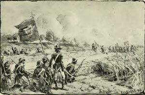 The Irish Rebellion of 1798 began on 23 May, with the first clashes taking place in County Kildare on 24 May, before spreading throughout Leinster, as well as County Antrim and other areas of the country. French soldiers landed in Killala on 22 August and participated in the fighting on the rebels' side.[12] Even though they had considerable success against British forces in County Wexford,[13] rebel forces were eventually defeated. Key figures in the organisation were arrested and executed.